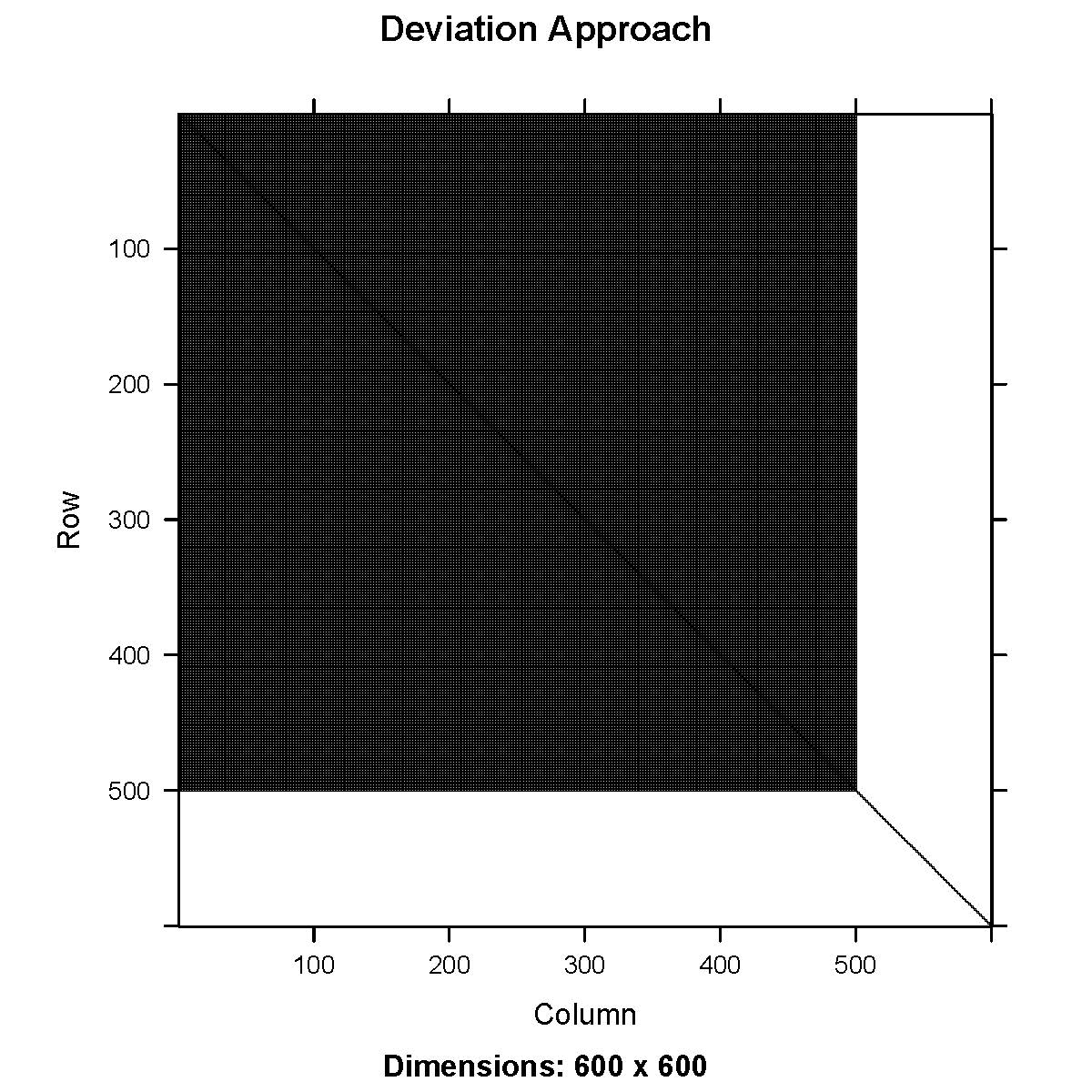 nll <- nll - sum(dnorm(y, lambda, sdo, TRUE))Under this formulation, the process approach results in a sparse Hessian which is a function of the inverted covariance matrix, while the deviations approach results in a dense Hessian (Fig 1). Models were evaluated with RTMB (Kristensen, 2019) using the TMB package (Kristensen et al., 2016) in R (R Core Team, 2024). TMB relies on the Laplace approximation to integrate out random effects during an inner optimization step, and afterwards, the joint negative log likelihood is minimized with respect to the fixed effects. The Laplace approximation requires up to the second-order partial derivatives of the joint negative log likelihood with respect to the random effects to be evaluated at each inner optimization step. The computation cost of the Laplace approximation is primarily determined by the cost of inverting the Hessian, which is for N-dimensional parameter space. As the number of random effects increases, the computational cost of inverting the dense Hessian from the deviations approach increases rapidly, while the cost of inverting the sparse Hessian from the process approach increases much more slowly.
