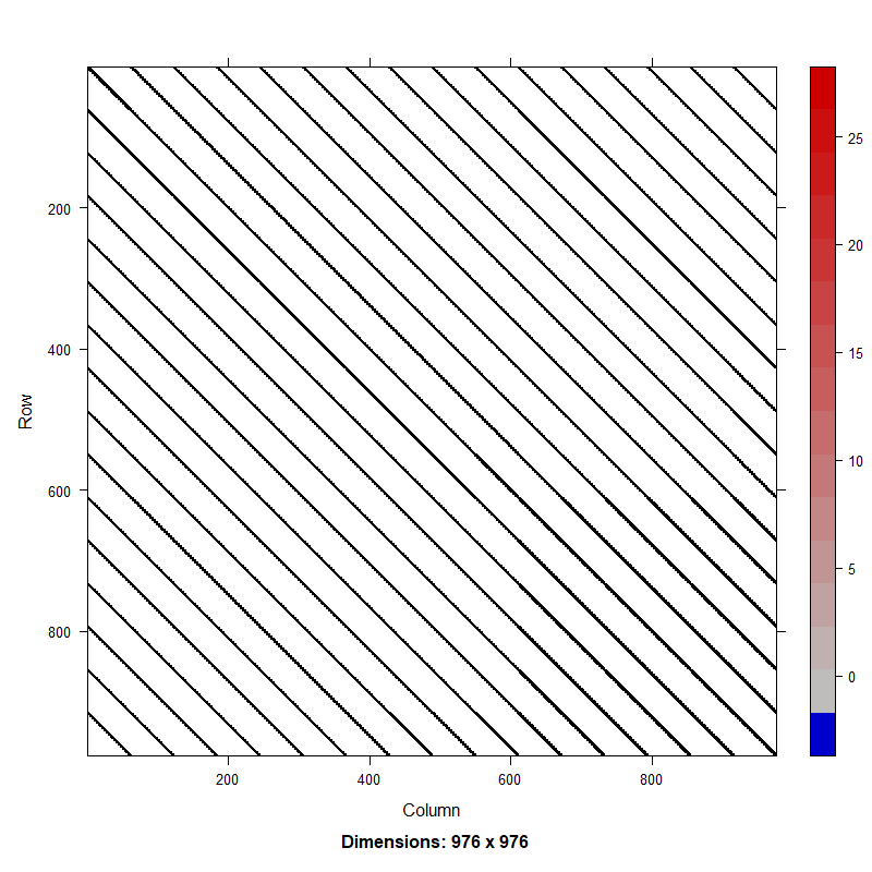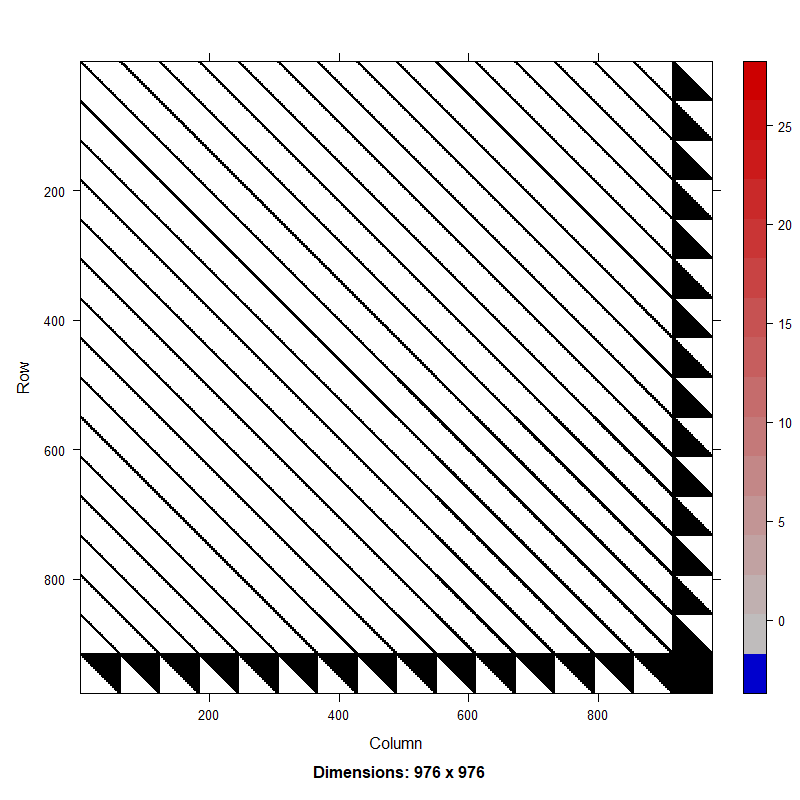 Figure 2. Hessian matrix for random effects model with a first-order autoregressive (AR1) process on recruitment in a catch-at-age model using deviations approach (top) and process approach (bottom).