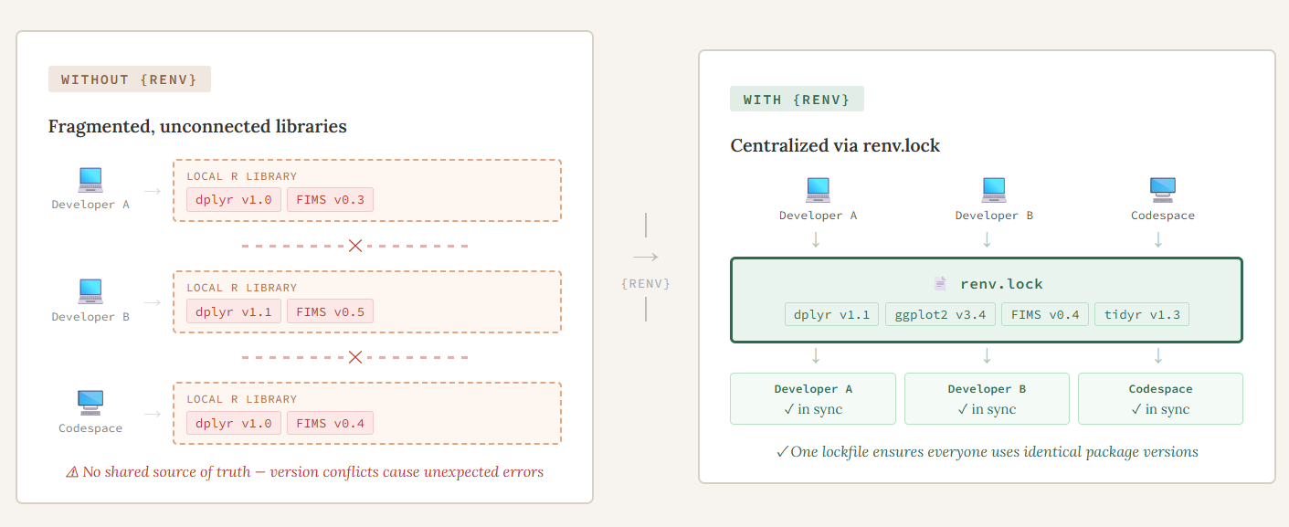 Because both projects are worked on by multiple developers on their local machines as well as in a codespace, we needed an easy way to make sure that each person is using the same version of all packages used when writing/running the code, without them having to change the version they have on their local machine. Before we started writing any code for {FIMSdiags}, we initialized an empty {renv} project (renv::init()). This created the key files needed to make everything work, namely the renv.lock file, activate.R, and the {renv} library. The renv.lock file contains all of the metadata for every package that is used in the project and is what is shared in the repository to make everything “work”. We decided later on to add {renv} to the case studies but the initial set up was generally the same. The only difference was that some packages used in the codebase were difficult to install automatically, so we installed those manually using renv::install().